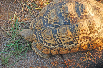 ↑左圖:快離開公園的時候,黑人司機突然倒車,原來是看到路邊的豹紋象龜(Leopard tortoise)! 我從車窗往下望,看著牠美麗的背甲映著夕陽,瞧牠慢條斯里的啃著路邊的草,雖然隔著玻璃卻很能體會愛龜者的心情。 ↑右圖:炙熱的柏油路上,看到一隻變色龍緩緩爬過。蹣跚的步法配上獨特的腳爪,看起來煞是有趣。可惜因距離過遠與鏡頭焦段不足,只能拍到這種大小的畫面而已。