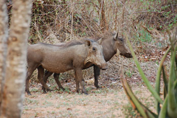 ↑左圖:屁股上像是有靶一樣的Waterbuck 非洲水羚,看起來彷彿是要引誘人射箭一樣。其實很多羚羊與鹿類,很喜歡在臀部上做毛色的文章;這是有警告同伴「有掠食者接近」的作用。 ↑右圖:紅鼻樹兔,瞇著眼睛躲在樹叢間休息,紅色的鼻子與淡藍色的上顎是其特徵。