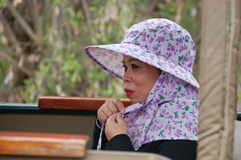 ↑左圖:出發前的留影,這位是我們的女導遊兼駕駛。從駕駛算起車子一共有四階,連駕駛加起來一行才7個人,視野非常的廣闊。 ↑右圖:團員之一的大姐,因為害怕曬傷與風沙,所以做如此精緻的台式裝扮。