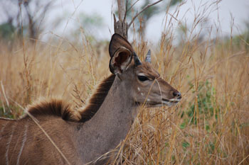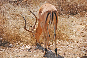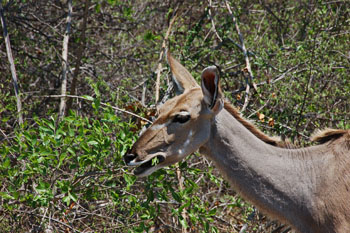↑公的非洲大羚羊角會隨長度增加,而有著漂亮的彎曲,最長可達1.6公尺。牠們似乎對於獵遊的旅客們已司空見慣,就算車子距離很近,還是照常吃牠們的灌木叢樹葉。