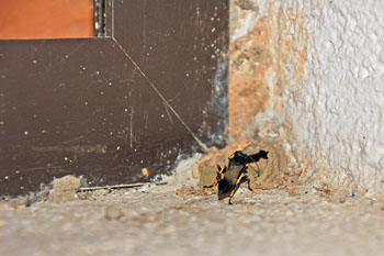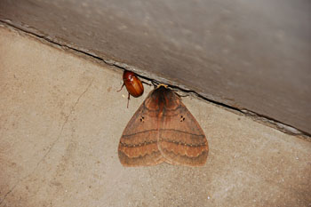 ↑左上:在窗角用著溼泥做巢的長腳蜂。↑右上:連小便注視著窗台時,都能拍到螳螂。 ↑左下:這是台灣很少見的巨大步行蟲。↑右下:低頭望還有蛾與金龜子。