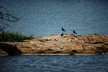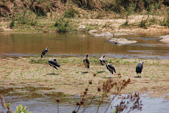↑左圖:在河邊的石頭上,停了一隻鳥。本來以為是白頭鷹,結果拍照放大景觀後,才知道是顱鶿的一種(澳洲篇出現很多,不過頭不是白的。) ↑中圖:沙洲上的鳥類,使用了特殊的色調來改變味道。 ↑右圖:Marabou stork﹙非洲禿鸛﹚。烈日下,但見一群沒有頭毛的鳥族,一時看的頭上也跟著熱了起來…