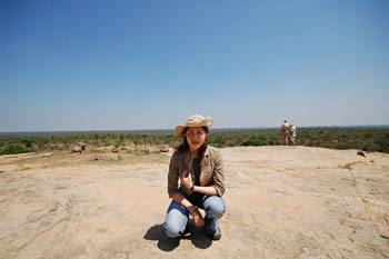 ↑在一塊隆起的小丘上,四輪驅動車暫停遠眺。因為怕干擾或是被動物襲擊,這是唯一可以下車的地方。 除了認真的望遠找看看有沒有花豹外,還趁機與導遊合照一下。故意挑了一張拍完照要分開的畫面﹙左圖﹚,顯得格外有趣。