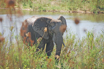 ↑African Elephant 非洲象 ,和印度象不同的是,非洲象是雌雄都有著長長的象牙。在動物園裡看到大象,就如同看一個慈祥的卡通人物;但在野外看非洲象,卻得敬畏牠三分。脾氣不能用「溫馴」來形容,而只能說是喜怒無常吧。