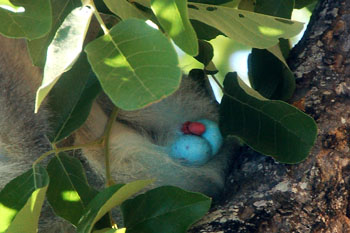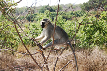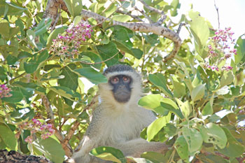 ↑Vervet Monkey 藍猴,渾身灰毛白毛,哪來的藍猴稱呼?其實樓上的「紅鼻樹兔」,根本沒有這種動物,紅色的部份是牠的小鳥,藍色部份乃蛋蛋也;也就是「藍」字的由來。 動物實在很奧妙,哺乳動物有這種不自然的艷麗藍彩也就罷了,而且還是出現在蛋與鳥上!人類唯恐遮羞不及,還把器官藏在兩層褲子下,而牠老兄卻昭告天下位置所在… 妙哉妙哉!
