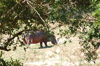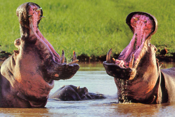 ↑Hippopotamus 河馬 雖然動物園裡的河馬尋常可見,不過充斥著辛辣的尿騷味,急促的咀嚼聲,伴隨著肉肉碰撞的帊瘩音。 但是為了一睹野生河馬的丰采,相機拿到脖僵手酸,眼睛盯到望眼欲穿。但是牠老兄還是不願在眾目之下張個嘴現身。好不容易有離開水面的機會,卻又是距離遙遠;望遠端+照片裁切,只能有這般畫質呈現…傷眼啊。﹙右下角是掃描明信片得來的 ,Photograph Gerald hoberman﹚