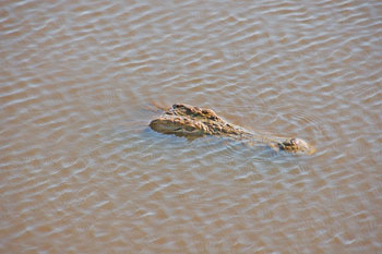 ↑傍晚的湖邊是可以看到許多動物的絕佳地點,不止哺乳類,鳥類與爬蟲類都會有不同目的而來此光臨。請看右圖左上角露出賊眼的尼羅鱷。