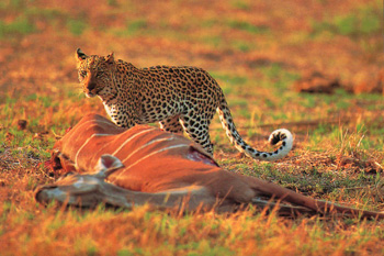 ↑左圖:獅子?不是從小看到大嗎?但是很抱歉,就是連獅子都沒有,只有腳印足跡的照片。回國後若有所失的檢討此次飛腳的遺珠之憾,卻發現連一隻肉食性的動物都沒看見。原來要看到大貓們﹙獅子、花豹、獵豹﹚是如此困難啊…!雖然女導遊努力找尋大貓的蹤跡,可惜還是未見獅與豹(非洲沒有老虎)。這是最沾上邊的了--獅子的腳印。 ↑右圖:Leopard 花豹,原以為花豹會常見,卻連個影子也沒有…不過在自然公園裡是很正常的,旅行社也不能保證一定看得到。望著每棵樹上的影子,脖子都痠了還是沒有,只好掃描明信片充數一下。