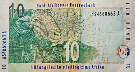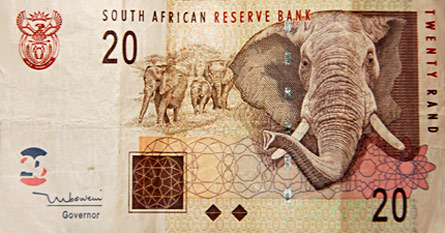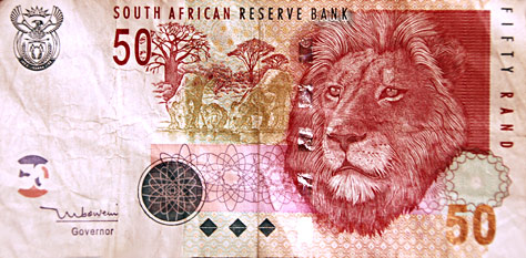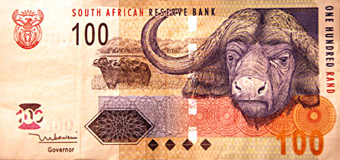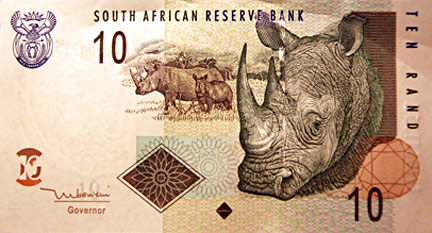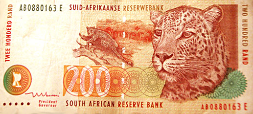 ↑南非的貨幣單位是RAND(稱為鍰或蘭德),而各種幣值的南非紙鈔,使用了五種動物﹙五霸﹚來表示。
