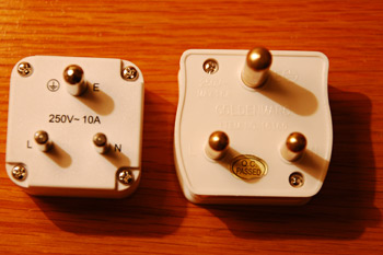 ↑家庭用電壓為220V,這是南非的大3叉圓形插孔插座,台灣市面上幾乎買不到轉接頭。我還特地到順發3C去找…結果買到了標示錯誤的第二張圖左邊那個,實際卻要用右邊的才行。
