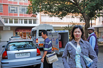 ↑左圖:我們的10人座小巴,後面還加掛一個行李箱。Abby左邊的是很讚的導遊蘇先生,右邊是司機「爵士樂先生」。