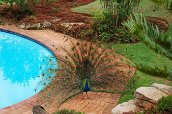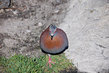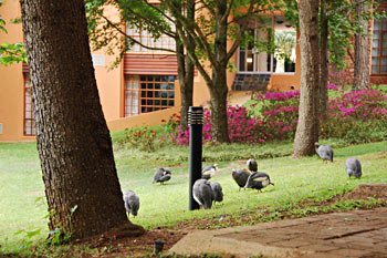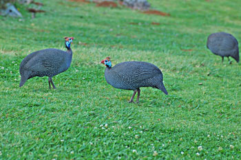 ↑左圖:一大清早的飯店,成群的野生珠雞就在草皮上啄食著,遠望就像一群身著華服的歐巴桑。 ↑右圖:請觀察牠們有趣的臉部彩妝。鮮豔的紅藍相間,彷彿是弄臣一般。
