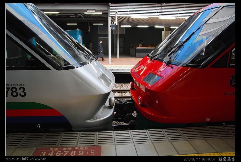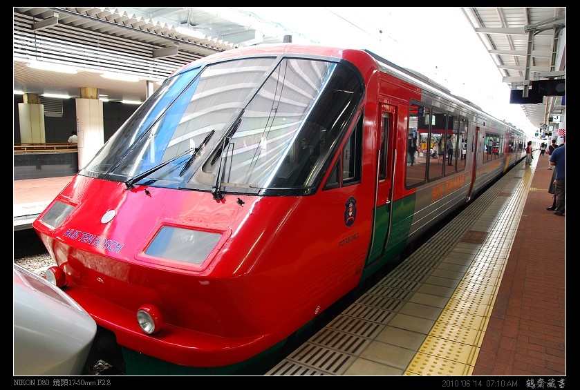 ↑紅色車頭這端正是我們所搭乘,由博多出發直達的「豪斯登堡號」。 |