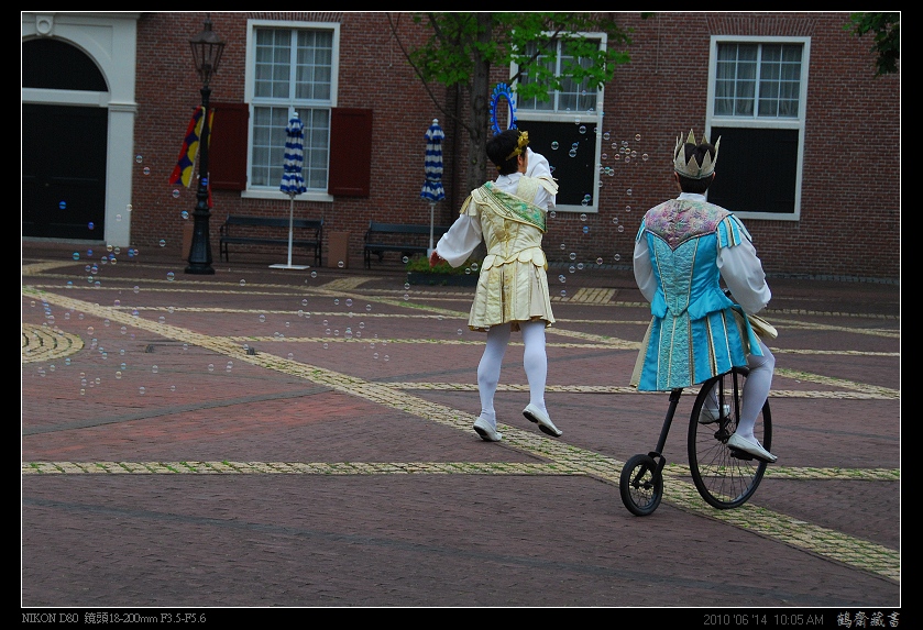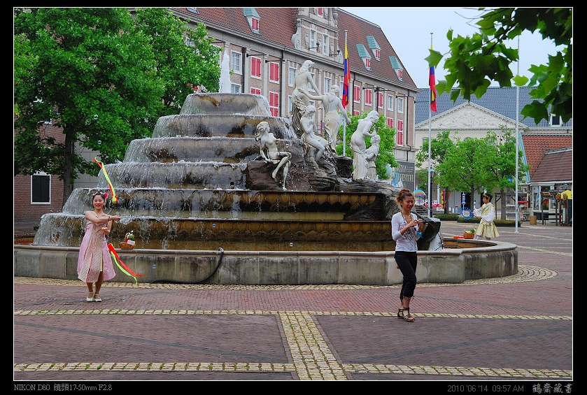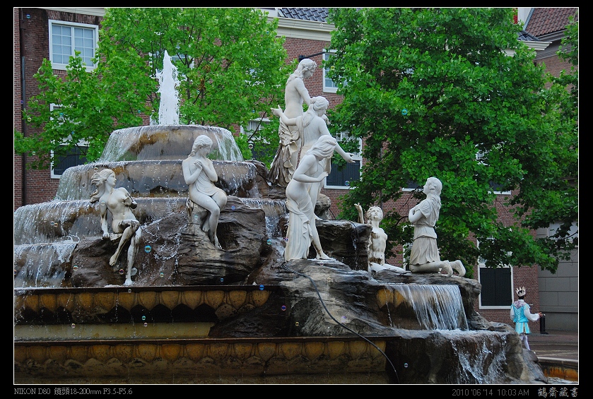 ↑中央噴水池週遭,比遊客還多的工作人員們,努力營造出歐洲街頭藝人﹙或是說宮廷貴族﹚的氛圍。 |
