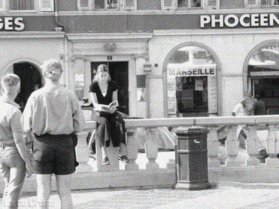 ←我很喜歡這個女生坐在廣場旁欄杆上讀書的隨性。