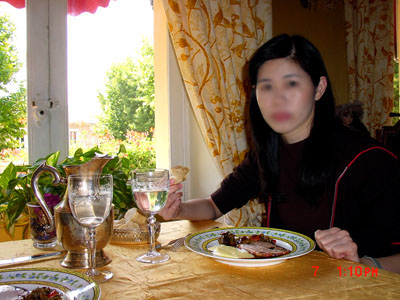 →午餐在一家安靜又有情調的鄉村餐廳。這是家感覺很古老的店,裡頭擺滿了身著縲絲華服的洋娃娃,從二樓的窗外望出去是人蹤稀疏的午後風光。Abby總是能以最飛快的速度卡位,在其他團員還在東張西望時,她已經搶到最佳的位置。前菜是一小Piece的鵝肝醬沙拉,照片中的主菜則是烤鴨胸配洋芋泥。