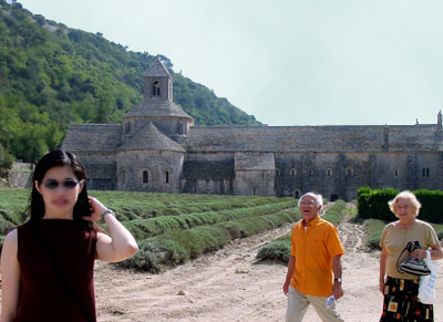 ↑最常被拿來當普羅旺斯建築物代表的賽農克修道院。這片廣大的薰衣草田已過了採收時節,所以看不到紫色的地毯。 不過多事的我還是改了原相片,所以有了右邊的「薰衣草盛開版」。