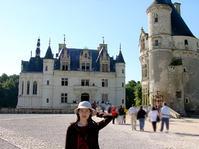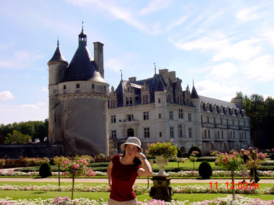 →座落於雪河之畔的奇濃索城堡,記載著兩個女人的恩恩怨怨。她們分別是法王亨利二世寵姬黛安娜﹙位於右邊﹚,和王妃凱薩琳。也就因為如此,城堡兩旁的花園造景也南轅北轍,各異其趣。