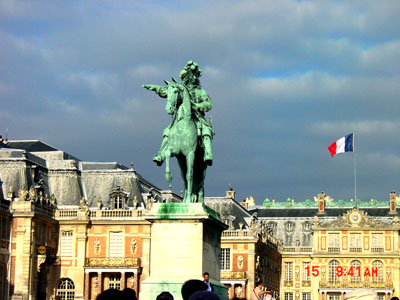 →凡爾賽宮正門前的雕像。在1682至1789年間,凡爾賽成為絕對君主制的基地。在太陽神的意願下,反射出象徵無上權勢的光芒;路易十四不愧為凡爾賽真正的創造者。