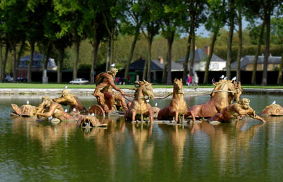 ←阿波羅池是我最喜歡的。路易十四把原來的天鵝池加寬,並配上著名的鍍金鉛製雕像組。駕馭馬車的阿波羅破水而出,噴泉則是漸歇性的噴發。弟比根據勒布倫的繪畫,在1668年至1670年間,於古貝林工廠完成了此不朽的雕像組。1670年安置在此,隔年對其作了鍍金工程。