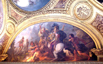 →國王正殿中的大力士「海格立斯」升天的情景。這個偉大的巨型天花板畫作中,共有142個人物,讓路易十五大為讚揚而欲晉見創作者。但作者勒穆瓦那以為國王會怕他再創造更好的作品殺了他,在筋疲力盡下,不久就自殺身亡了。