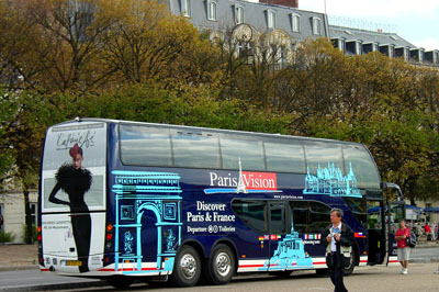 ←走出凡爾賽宮,我看見了奢華氣度與優雅人文兼具的漂亮巴士。車尾是老佛爺百貨公司的時尚廣告;車身則是法國名景點的剪影。